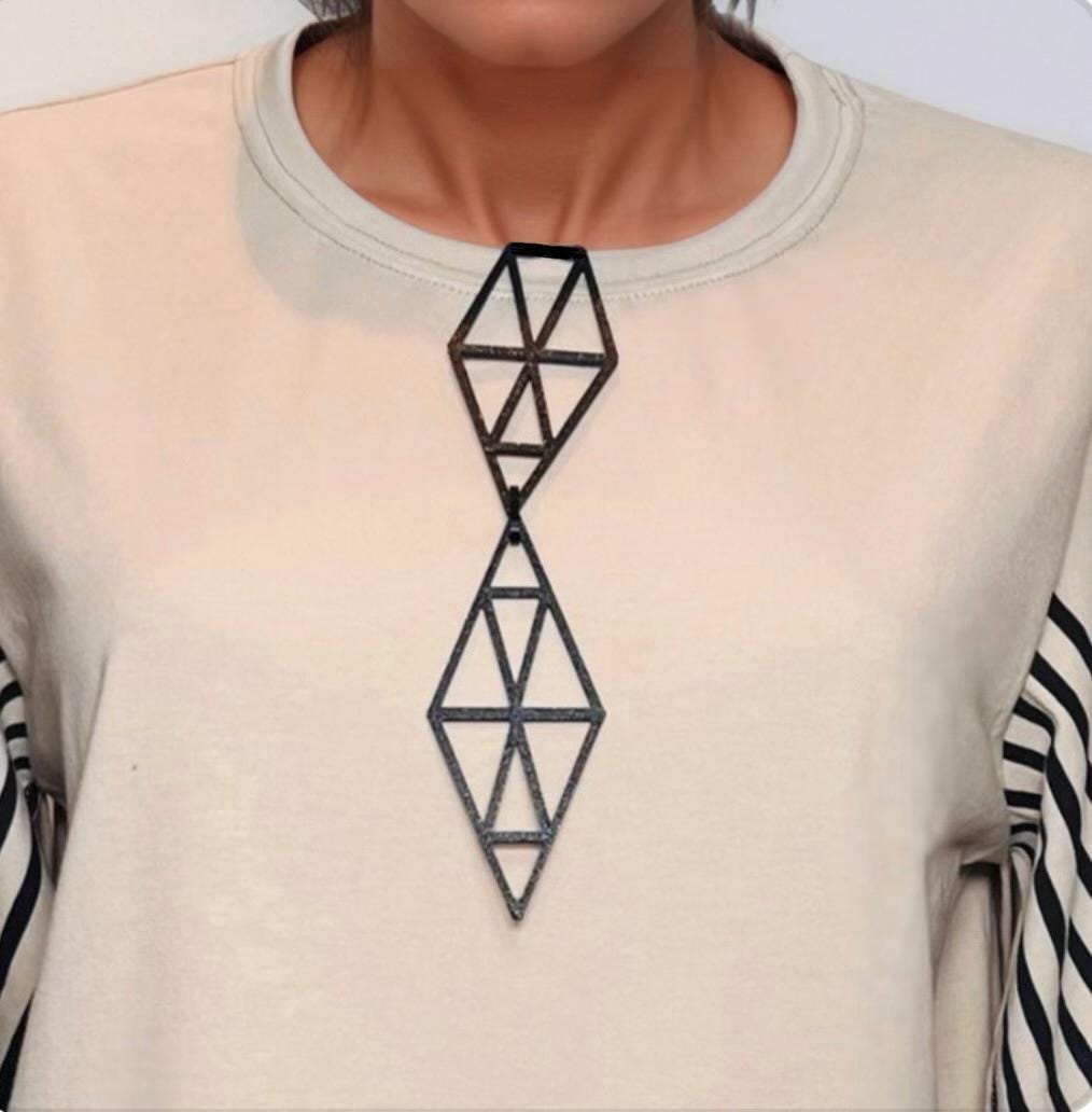 HOW TO ATTACH: Primary triangle slides onto garment. Secondary hanging triangle clips onto 1st. Set can be separated so that only one clip is worn.