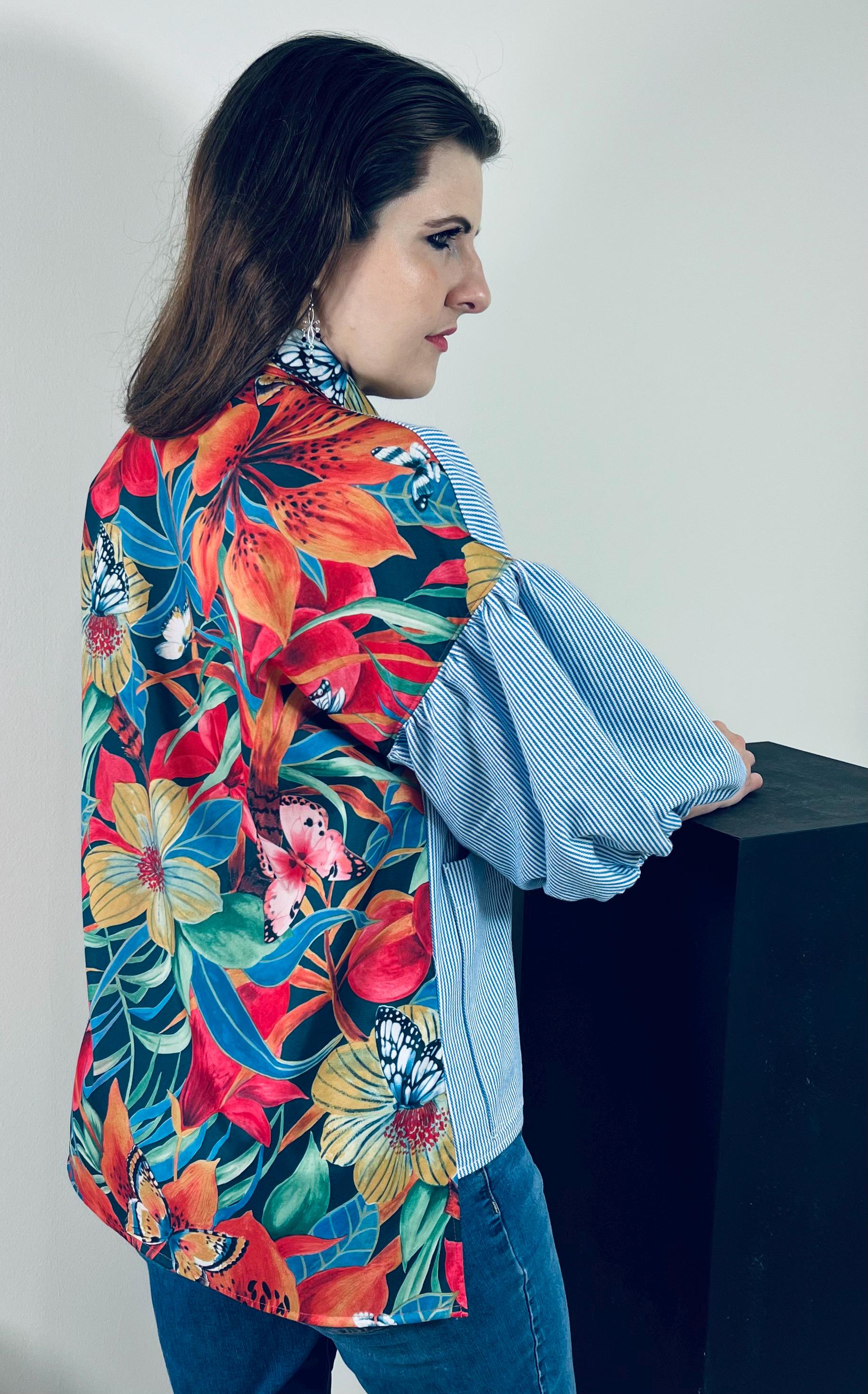 COLORS: Colors vary. The back of each garment is made of remnants donated by local upholstery shops. Therefore, NO 2 BLOUSES WILL BE THE SAME.. The front is made of striped cotton that coordinates with the colors of the garment back. The front may be green and white stripes, red and white stripes or blue and white stripes, depending on the predominant color of the flowered back.